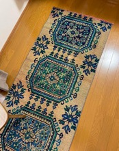 ベージュ地に、鮮やかなグリーンやブルーの色味がポイントのボタニカル柄ランナーラグです!